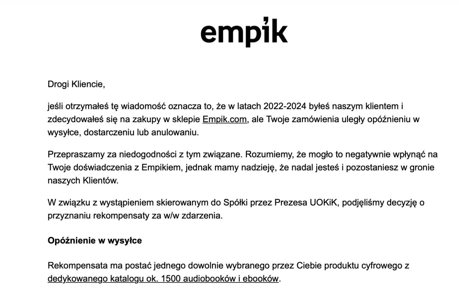 Dzięki interwencji UOKiK, klienci Empiku mogą liczyć na rekompensaty. Obejmują one osoby, których zamówienia z lat 2022–2024 zostały anulowane, opóźnione lub wysłane z opóźnieniem.