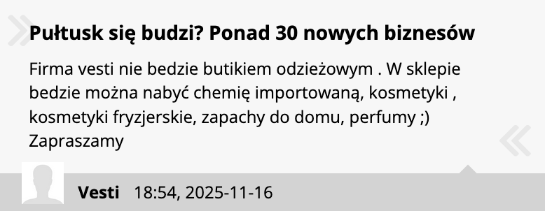Firma vesti nie bedzie butikiem odzieżowym . W sklepie bedzie można nabyć chemię importowaną, kosmetyki , kosmetyki fryzjerskie, zapachy do domu, perfumy ;) Zapraszamy