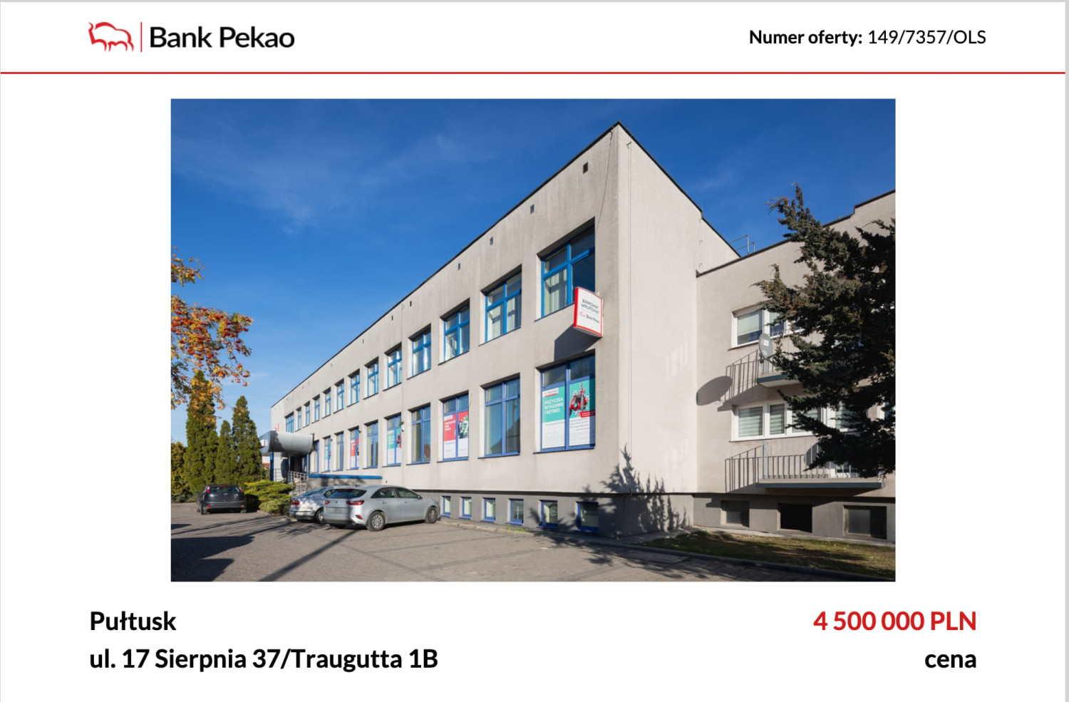 Informacja o wystawieniu na sprzedaż nieruchomości przy ul. 17 Sierpnia w Pułtusku może zaskoczyć wielu mieszkańców. To właśnie w tym miejscu od lat funkcjonuje popularna placówka Banku Pekao S.A., z której korzystają mieszkańcy miasta oraz okolicznych gmin. Dla wielu osób jest to jeden z najbardziej rozpoznawalnych punktów usług finansowych w Pułtusku.