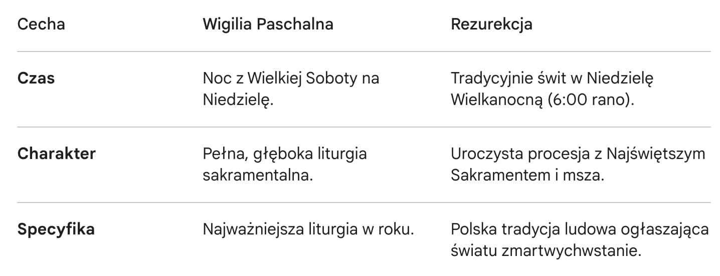 Z punktu widzenia liturgii Kościoła sprawa jest jasna: to Wigilia Paschalna jest najważniejszą celebracją zmartwychwstania Pańskiego. Rezurekcja ma ogromne znaczenie tradycyjne i duszpasterskie, ale nie zajmuje tej samej rangi w kalendarzu liturgicznym. Można powiedzieć, że Rezurekcja jest uroczystym ogłoszeniem prawdy o zmartwychwstaniu, natomiast Wigilia Paschalna stanowi jej najpełniejsze liturgiczne przeżycie. Właśnie dlatego nie powinno się tych dwóch pojęć utożsamiać, choć w codziennym języku dzieje się to bardzo często.