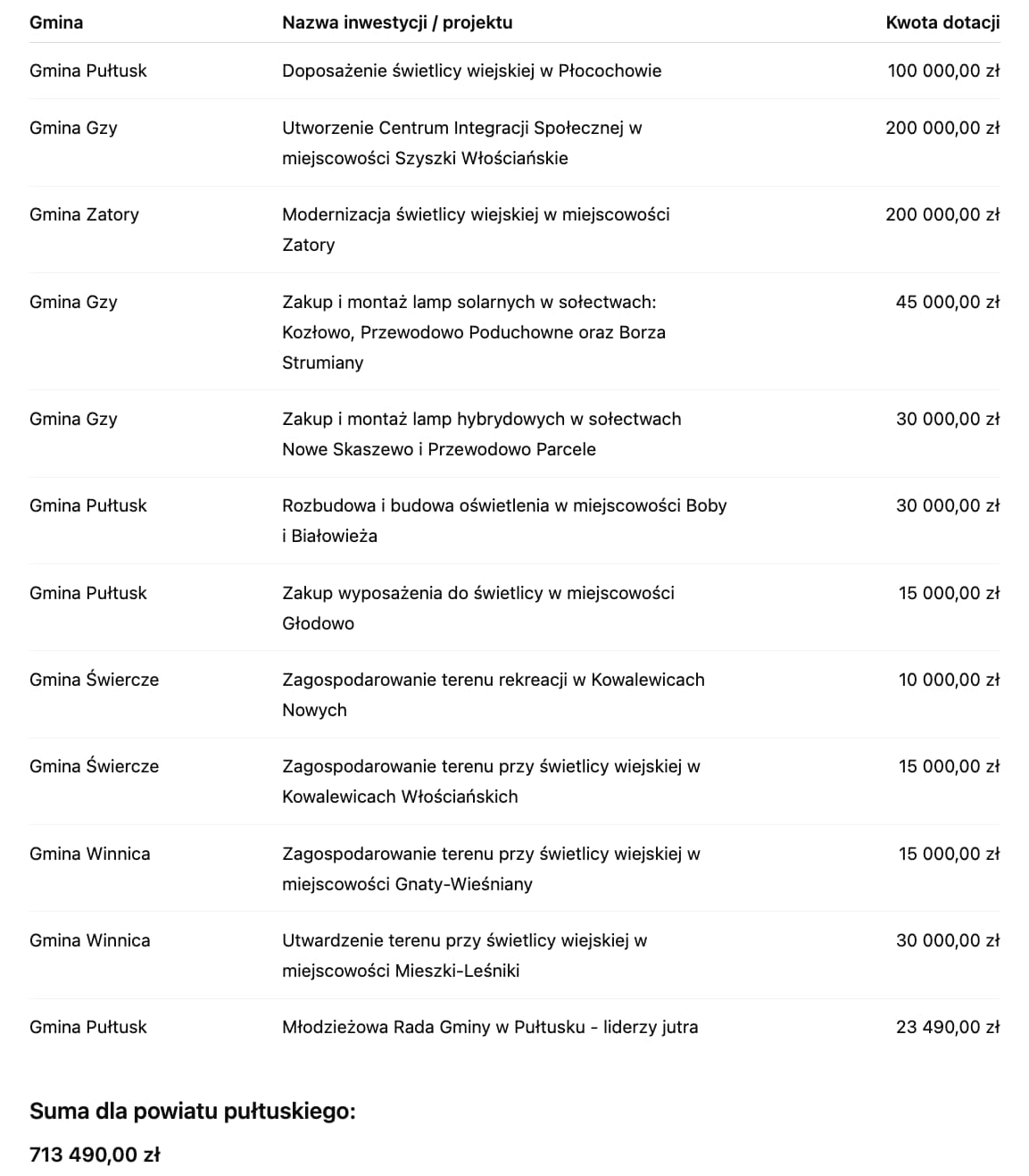 Największe pojedyncze wsparcie w powiecie pułtuskim otrzymały Gmina Gzy i Gmina Zatory po 200 tys. zł, a Gmina Pułtusk pozyskała środki zarówno na inwestycje infrastrukturalne, jak i projekt młodzieżowy. W praktyce oznacza to nowe wyposażenie świetlic, poprawę infrastruktury oświetleniowej oraz rozwój lokalnych miejsc spotkań i integracji. Łączna wartość wskazanych dotacji dla Pułtuska i gmin powiatu pułtuskiego wynosi 538 490 zł.