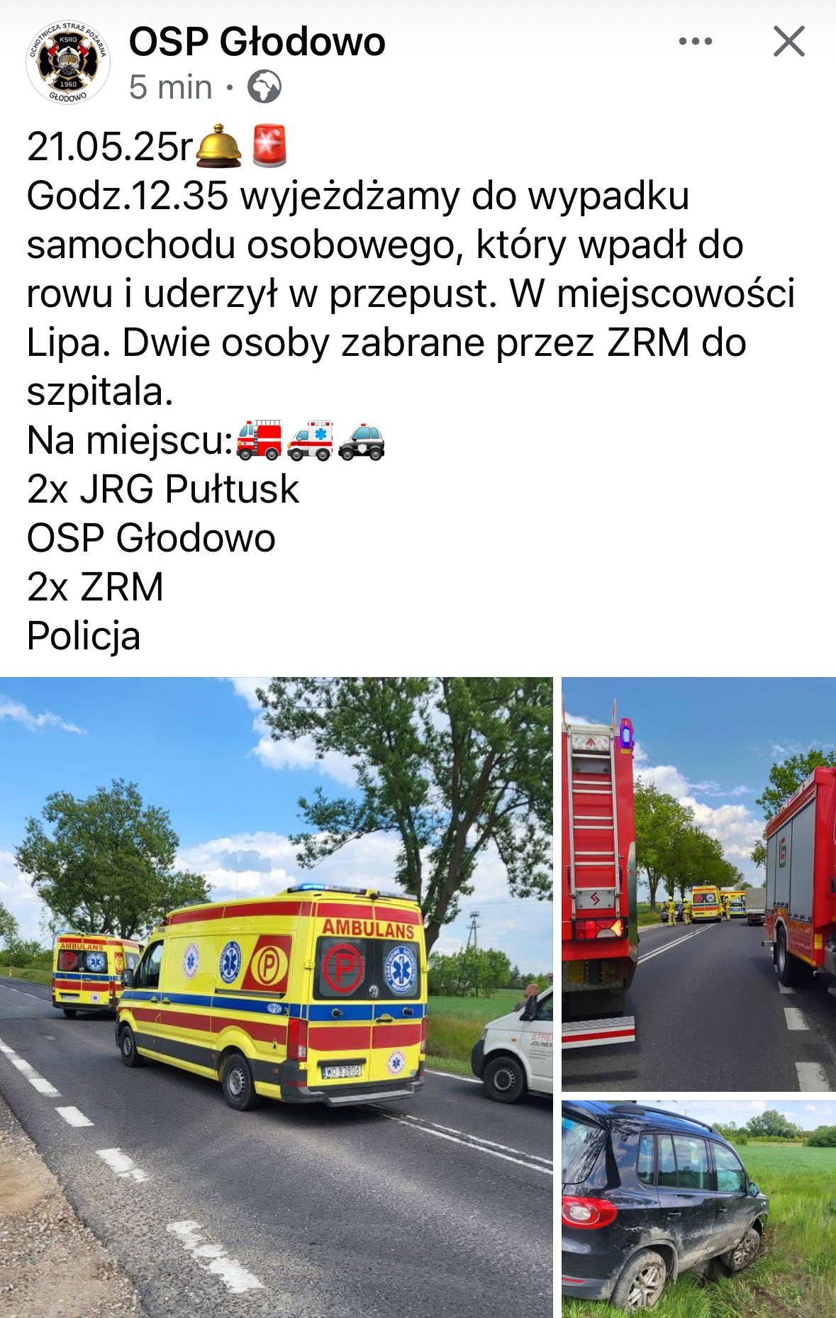 W akcji ratunkowej uczestniczyły dwa zastępy z Jednostki Ratowniczo-Gaśniczej w Pułtusku oraz strażacy z Ochotniczej Straży Pożarnej w Głodowie. Do zdarzenia wezwano również Zespół Ratownictwa Medycznego. Jedna z dwóch osób podróżujących autem odniosła obrażenia i wymagała pomocy medycznej.