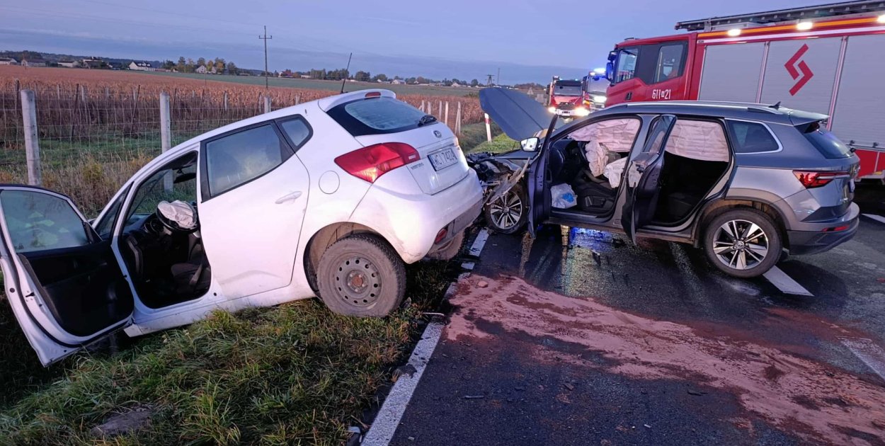 W poniedziałek 13 października br., tuż po godzinie 6 rano, doszło do groźnego wypadku drogowego w miejscowości Nowe Przewodowo (gm. Gzy). Na prostym odcinku drogi zderzyły się czołowo dwa samochody osobowe – biały hatchback oraz ciemnoszary SUV.