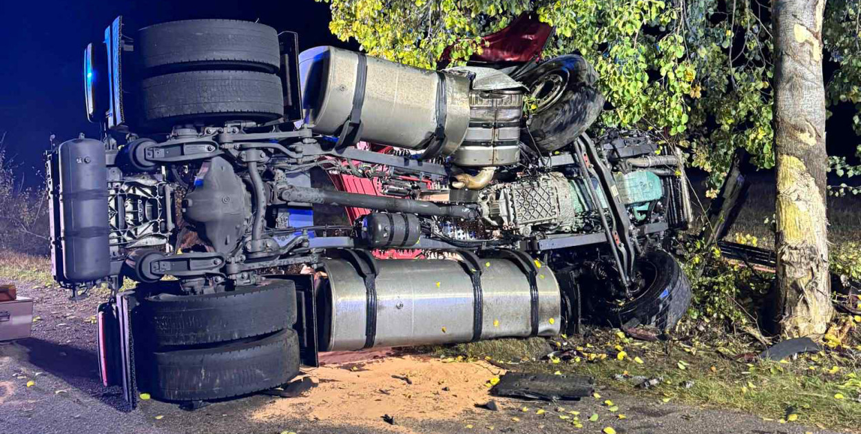Ciągnik siodłowy, na szczęście bez przypiętej naczepy, z nieznanych jeszcze przyczyn zjechał z jezdni, uderzył w przydrożne drzewo i przewrócił się na bok.