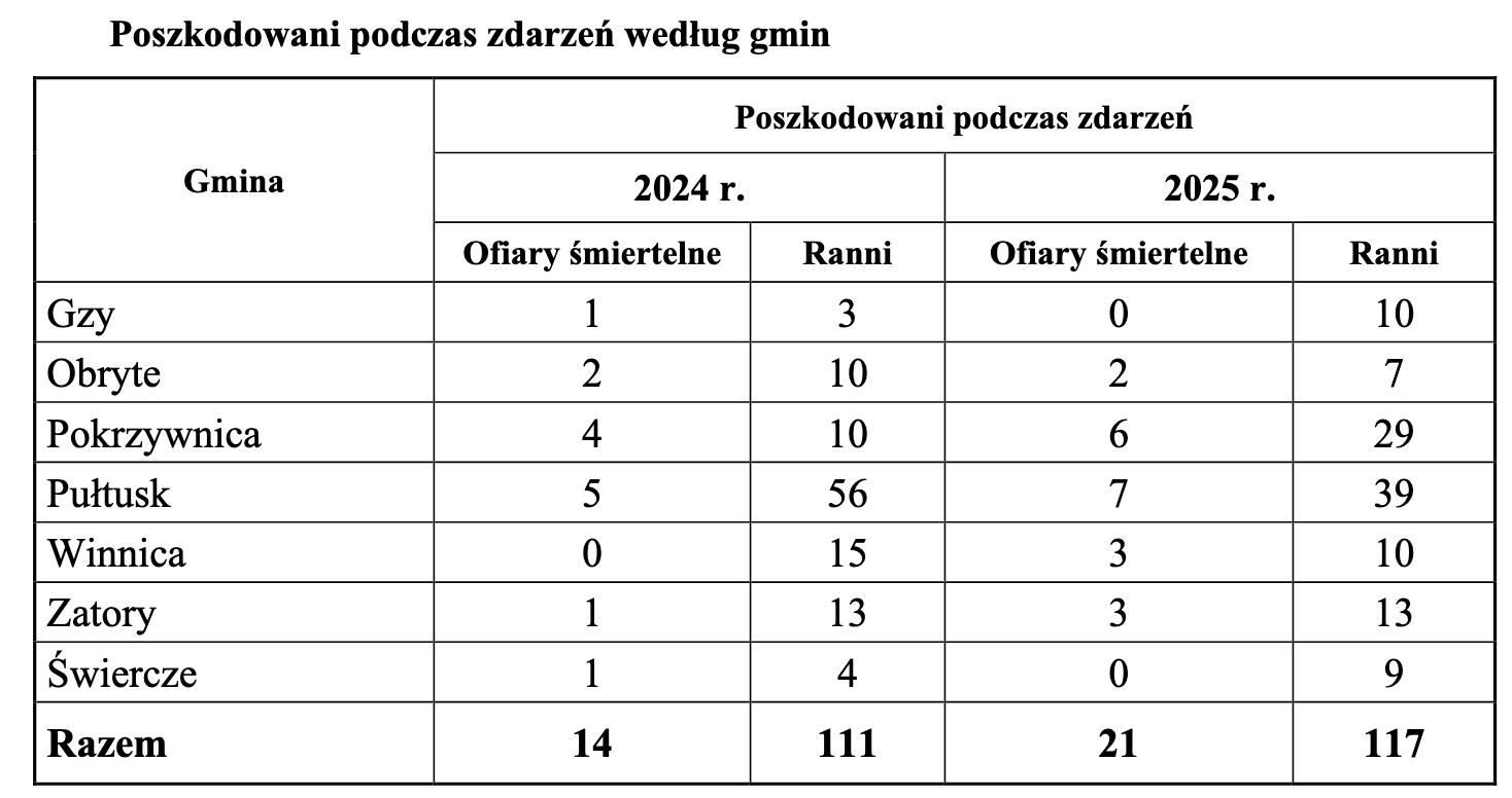 Najwięcej zdarzeń odnotowano na terenie gminy Pułtusk – 320 interwencji. Kolejne miejsca zajęły Pokrzywnica (78), Zatory (60) oraz Gzy (58). Statystyki jasno pokazują, gdzie skala zagrożeń jest największa i gdzie służby mają najwięcej pracy.