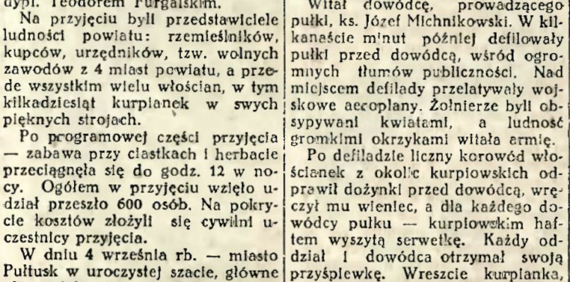 "Na przyjęciu byli przedstawiciele ludności powiatu: rzemieślników,kupców, urzędników, tzw. wolnych zawodów z 4 miast powiatu, a przede wszystkim wielu włościan, w tym kilkadziesiąt kurpianek w swych pięknych strojach".