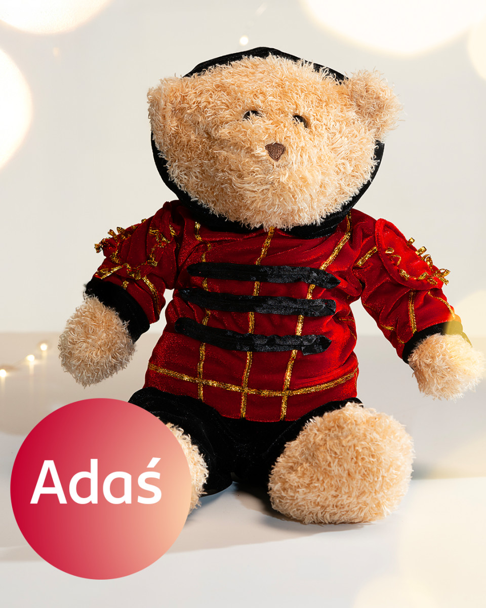 Adaś to chłopak, który z pewnością zna tajemnice zimowej elegancji. Jego jasnobeżowe futerko świetnie komponuje się z czerwoną bluzą zdobioną czarnymi pasami i złotymi przeszyciami. Jego strój przywodzi na myśl mundur dziadka do orzechów, ale w nowoczesnym, awangardowym wydaniu. Jest efektem współpracy 7-letniej Laury z Siemianowic Śląskich i Dawida Wolińskiego.