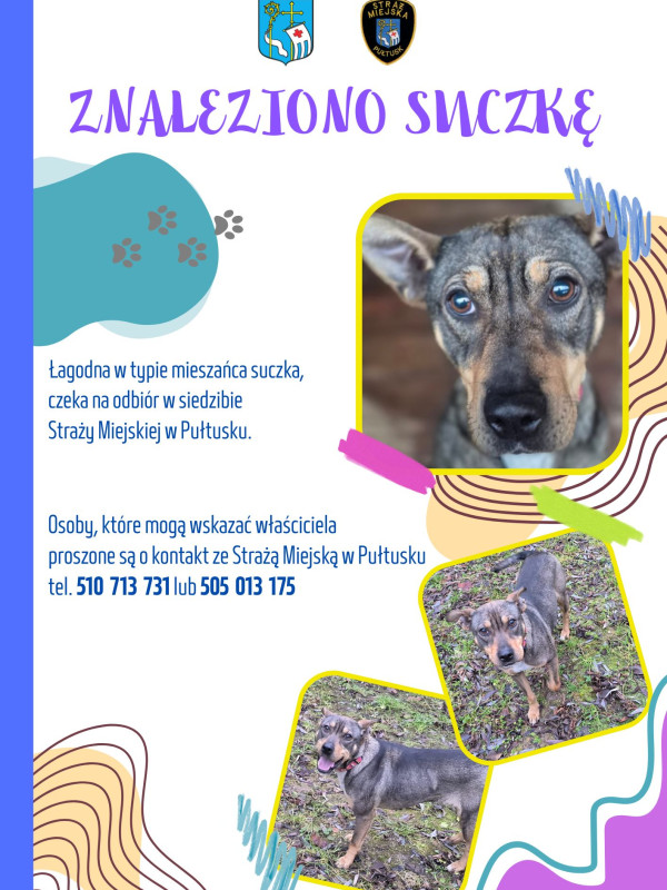 Znaleziona 24 listopada 2025 r., na osiedlu Reyenta, łagodna suczka w typie mieszańca, czeka na odbiór w siedzibie Straży Miejskiej w Pułtusku. Osoby, które mogą wskazać właściciela proszone są o kontakt ze Strażą Miejską w Pułtusku tel. 510 713 731 lub 505 013 175.