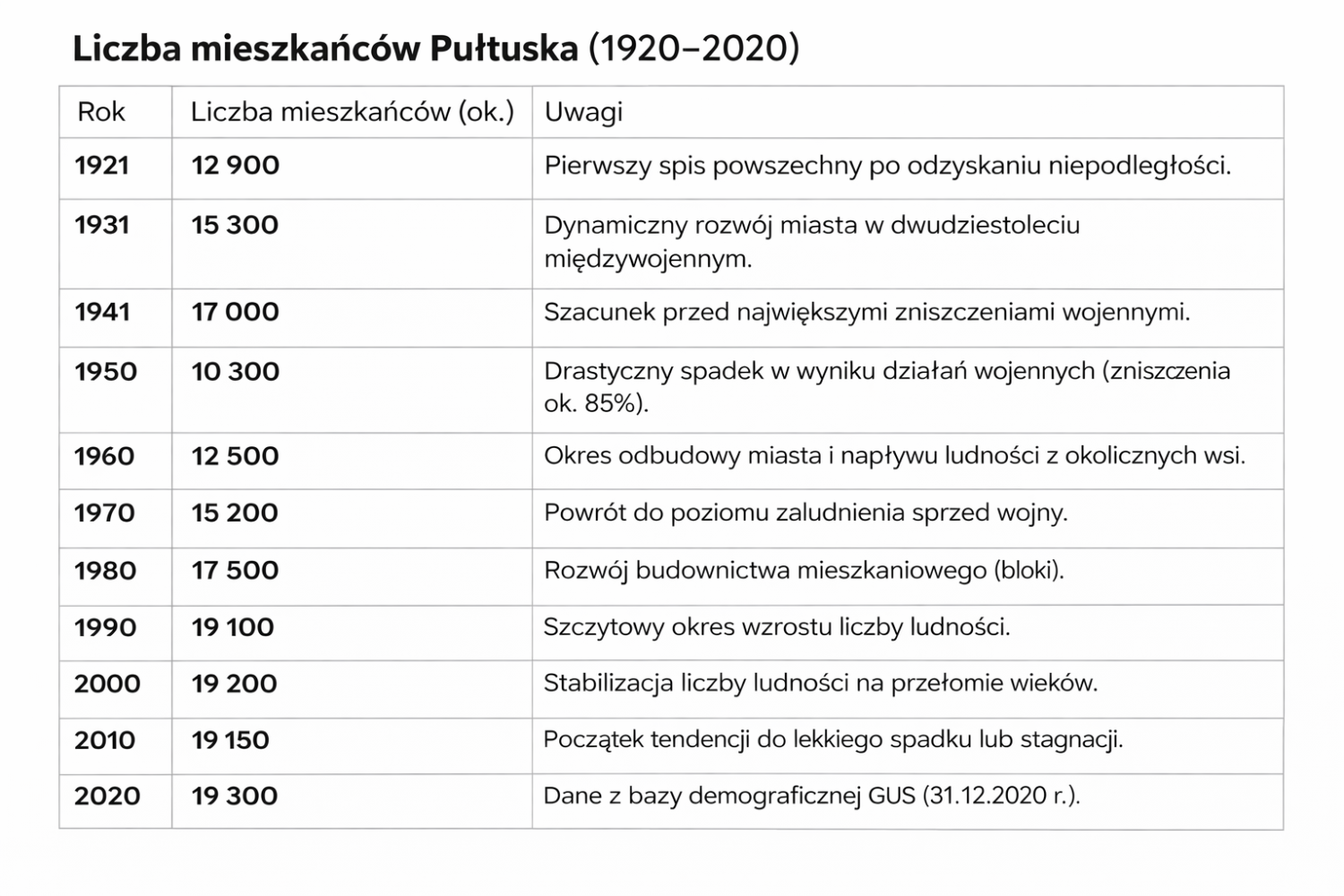 Niestety, ten obiecujący trend został brutalnie przerwany przez wojnę, która odcisnęła na Pułtusku piętno w sposób szczególnie dotkliwy. Miasto zostało zniszczone w około 85%, co przełożyło się na dramatyczny spadek liczby ludności.