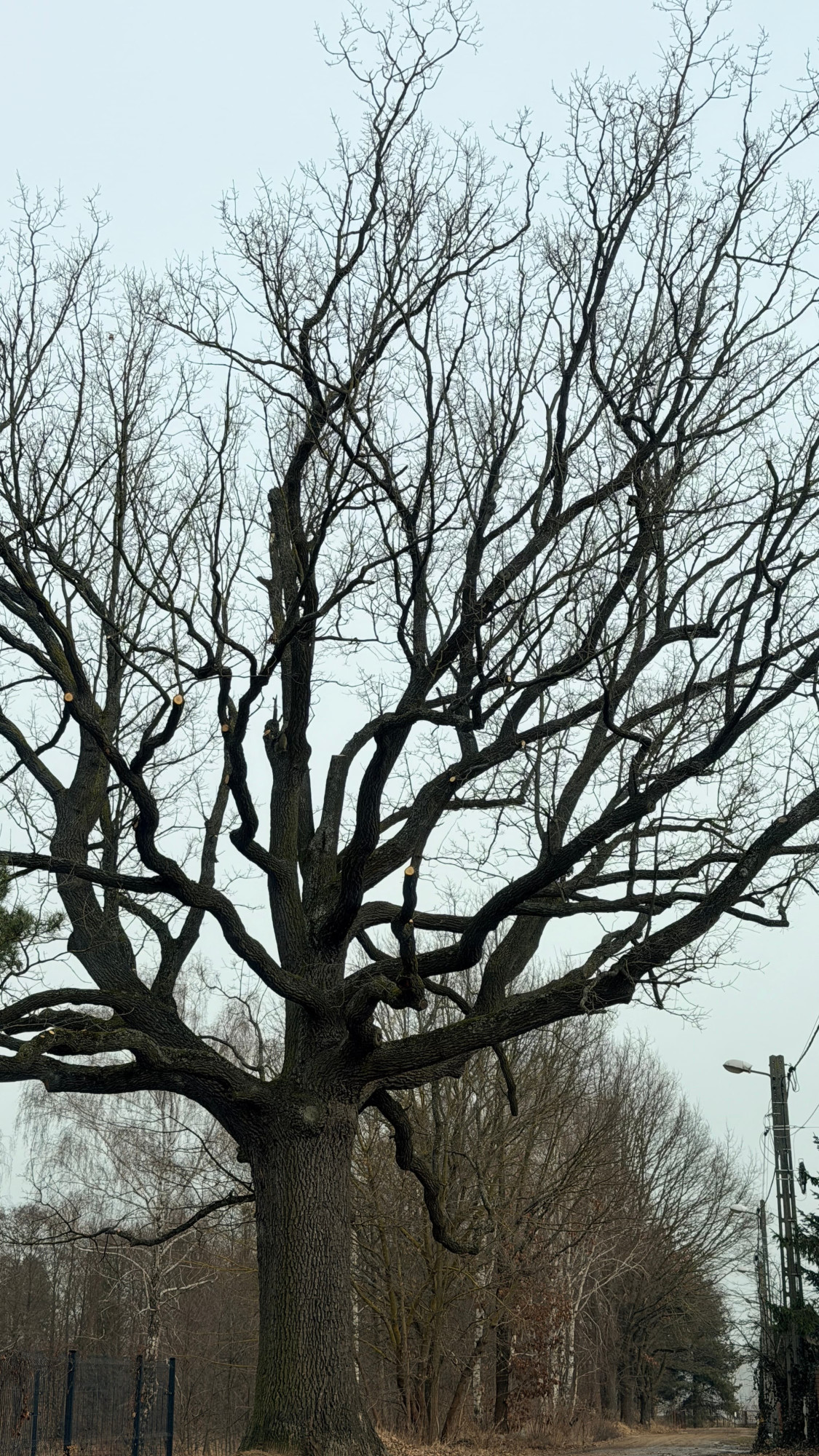 Najważniejszym elementem prac były cięcia sanitarne przeprowadzone w koronie drzewa. Usunięto gałęzie martwe, nadłamane oraz zamierające, które mogły stanowić zagrożenie dla otoczenia. Szczególną uwagę poświęcono konarom znajdującym się w pobliżu linii energetycznej, minimalizując ryzyko awarii infrastruktury oraz uszkodzeń podczas silnego wiatru.