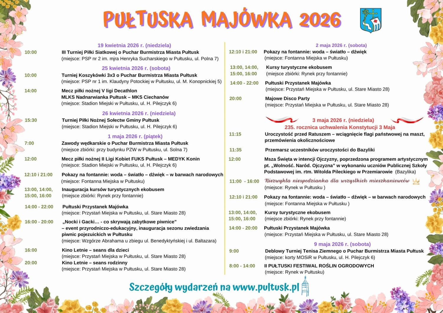 Kulminacją będzie weekend majowy – z pokazami fontanny, kursami ekobusem, kinem letnim oraz „Pułtuskim Przystankiem Majówka” na przystani miejskiej. Nie zabraknie także wydarzeń edukacyjnych, jak zwiedzanie piwnic pojezuickich czy uroczystości patriotycznych 3 maja.