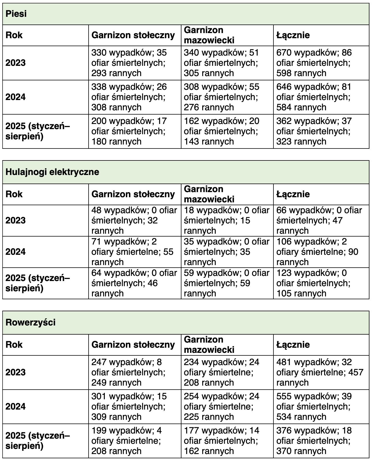 Według danych Komendy Wojewódzkiej Policji, w 2025 roku (od stycznia do sierpnia) na Mazowszu doszło do 162 wypadków z udziałem pieszych. W ich wyniku 20 osób straciło życie, a 143 zostały ranne. Choć liczby są nieco niższe niż w analogicznym okresie roku poprzedniego, nadal pozostają alarmujące.Najczęstszą przyczyną wypadków pozostaje nieustąpienie pierwszeństwa pieszemu na przejściu, co stanowi problem zarówno w dużych miastach, jak i mniejszych miejscowościach. Policja apeluje o rozwagę i wzajemny szacunek między kierowcami a pieszymi.