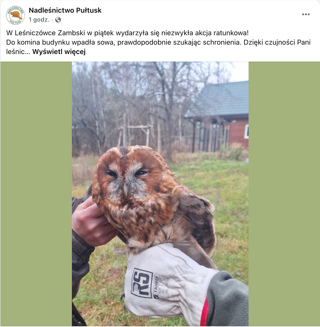 W piątkowy poranek w Leśniczówce Zambski doszło do nietypowego zdarzenia, które mogło zakończyć się tragicznie. Do komina jednego z budynków wpadła sowa, najprawdopodobniej szukając schronienia przed deszczem lub drapieżnikiem. Zwierzę zauważyła Pani leśniczy, która natychmiast podjęła działania i wezwała pomoc. To właśnie jej szybka reakcja sprawiła, że akcję udało się rozpocząć na czas. Po otwarciu komina okazało się, że sowa jest żywa, choć wyraźnie wyczerpana.