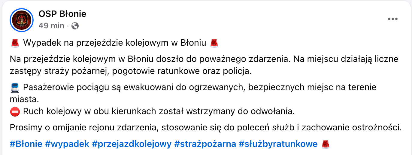 - W miejscowości Błonie, na przejeździe kolejowym zatrzymał się samochód. Uderzył w niego pociąg, a następnie drugi nadjeżdżający z przeciw. Samochód zapalił się, a od niego lokomotywa - powiedział PAP oficer prasowy Komendy Powiatowej Państwowej Straży Pożarnej w Powiecie Warszawskim Zachodnim mł. kpt. Damian Dolniak.